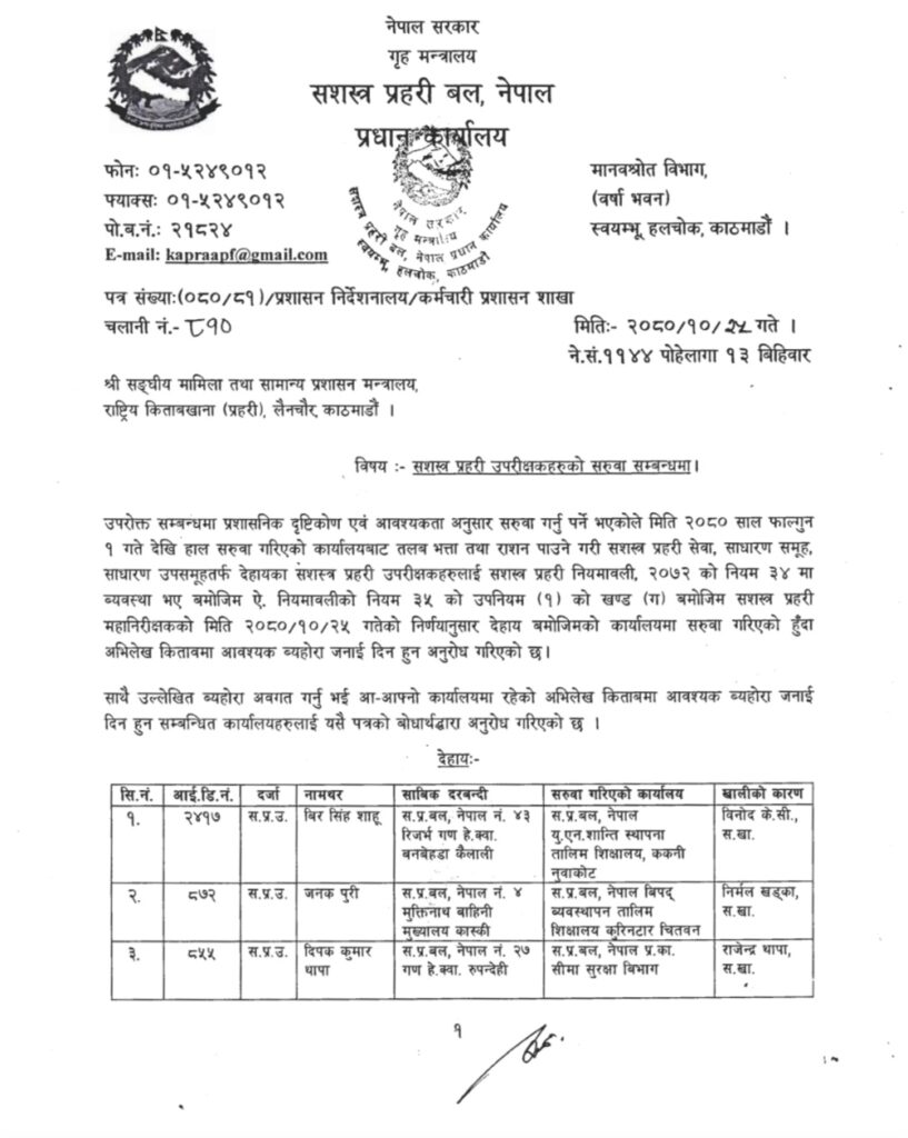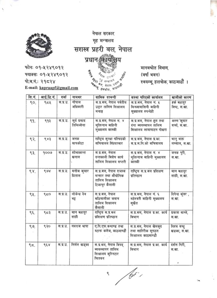 सशस्त्र प्रहरी महानीरिक्षक राजु अर्यालले फागुन १ गतेदेखि सरुवा गरिएको कार्यालयबाट सेवा सुविधा पाउनेगरी बिहीबार १ सय जनाको सरुवा गरेका हुन् ।