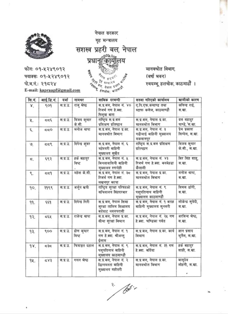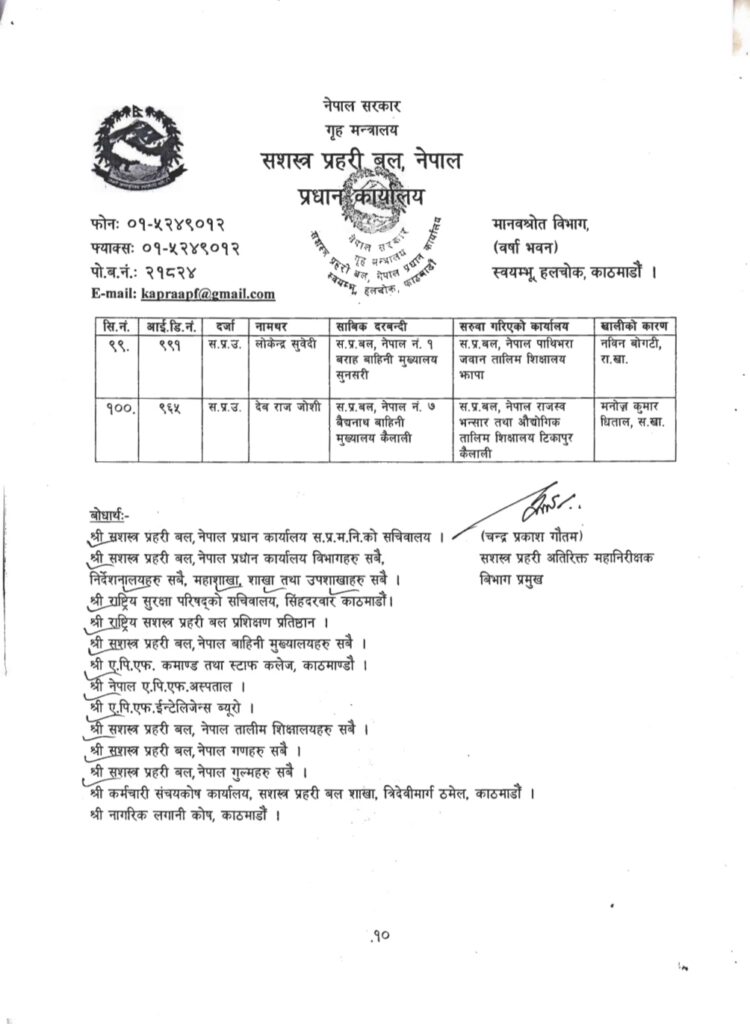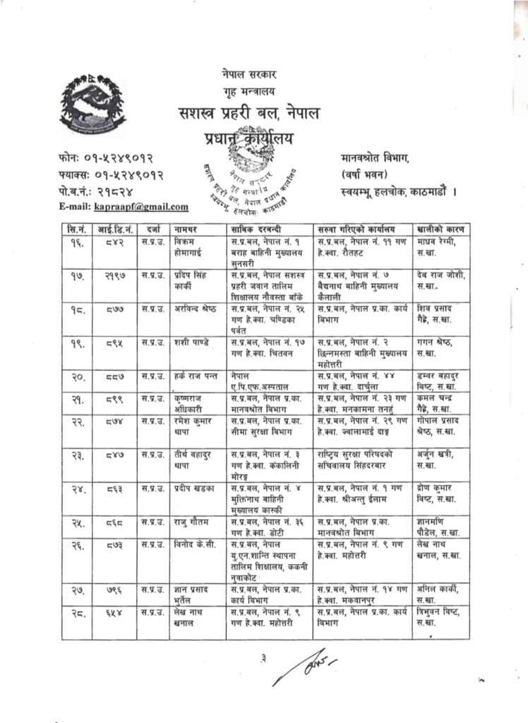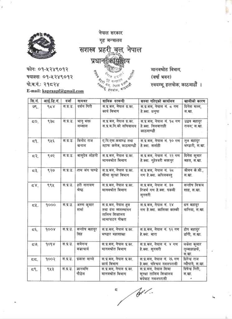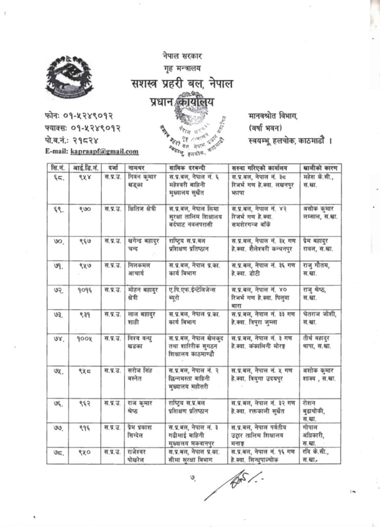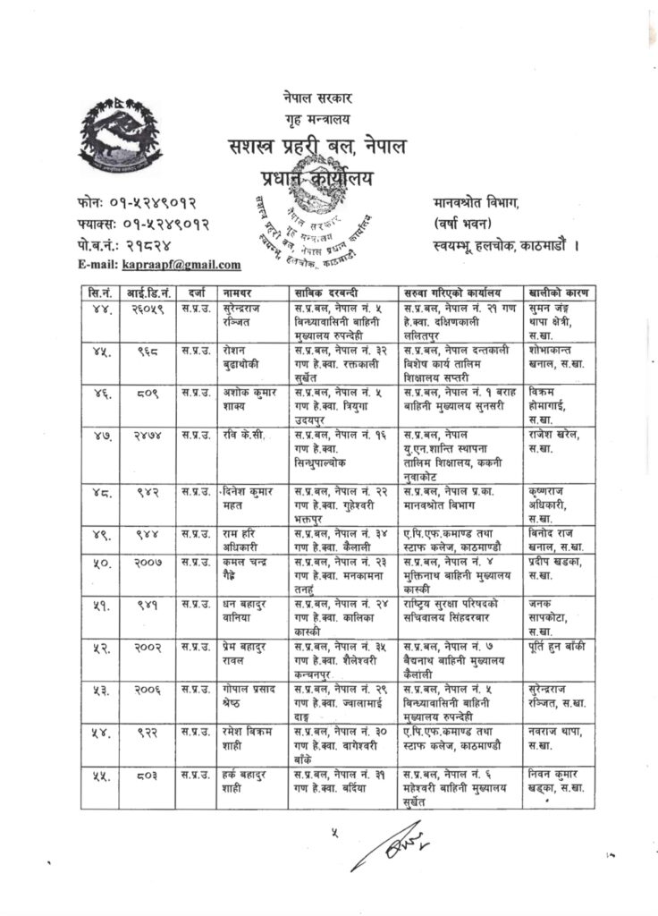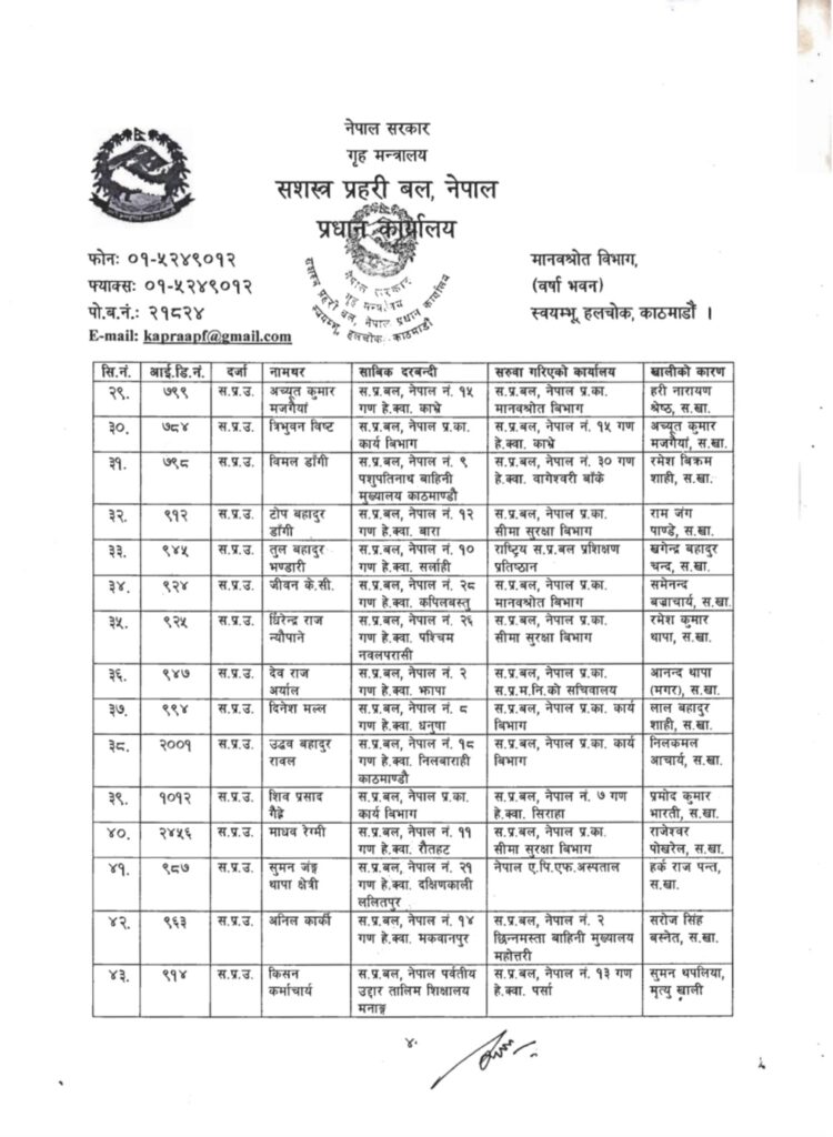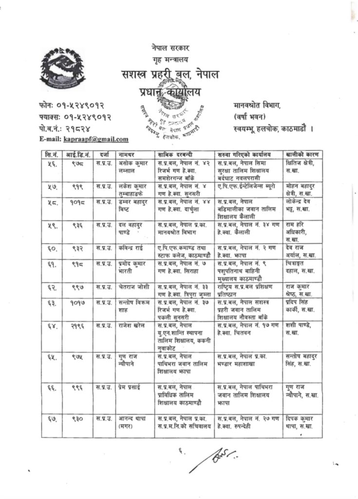 त्यस्तै नम्बर–३८ रिजर्भ गण झापामा निवन कुमार खडका, गण नम्बर–४२ बाँकेमा क्षितिज क्षेत्रीलाई सरुवा गरिएको छ । नम्बर–४० गण पिलुवा बारामा मोहन बहादुर क्षेत्री, गण नम्बर–३ मोरङमा विश्वबन्धु खड्का र गण नम्बर–१२ बारामा सन्तोष बहादुर सिंहलाई पठाइएको छ ।
