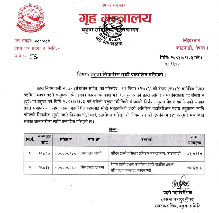 बैशाख ३ गते बसेको बढुवा समितिको निर्णय अनुसार डीआईजी उमेशराज जोशी र भिमप्रसाद ढकाल एआईजी पदमा बढुवा सिफारिस भएका हुन् । उमेर हदका कारण क्रमश: बैशाख ५ र बैशाख ७ गते एआईजी सन्दीप भण्डारी र मिरा चौधरी अवकाशमा जाँदैछन् । सोही रिक्त हुने एआईजी पदमा डीआईजी उमेशराज जोशी र भिमप्रसाद ढकाल बढुवा सिफारिसमा परेका हुन् ।
