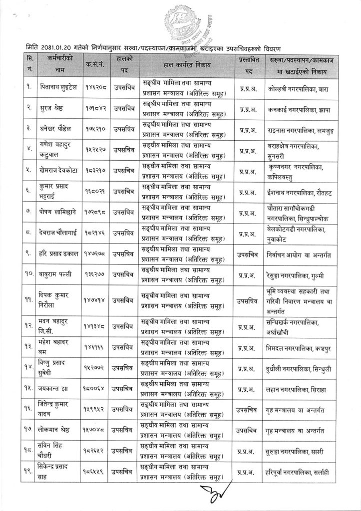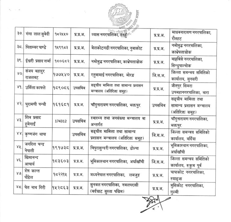 भैरहवा, २० बैशाख। संघीय मामिला तथा सामान्य प्रशासन मन्त्रालयले एकैपटक ३७ नगरपालिकाका प्रमुख प्रशासकीय अधिकृतसहित ४८ उपसचिवको काज, सरुवा तथा पदस्थापन गरेको छ।