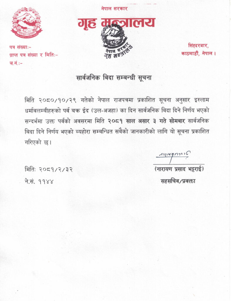 गत माघ २९ गते नेपाल राजपत्रमा प्रकाशित सूचना अनुसार इस्लाम धर्मावलम्बीहरुको पर्व बक्र ईद (उल-अजहा )का दिन सार्वजनिक बिदा दिने निर्णय भएको थियो ।