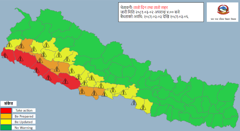 आगामी चार दिन (असार ३ गतेदेखि ६ गते) सम्म तातो हावा तथा तातो लहरको सम्भावना रहेको महाशाखाले जनाएको छ । सुदूरपश्चिम र लुम्बिनी प्रदेशका तराई भू-भागका केही स्थानहरूमा बिगत केही दिन देखि अधिकतम तापक्रम ४० डिग्री सेल्सियस वा सो भन्दा बढी मापन गरिएको छ ।
