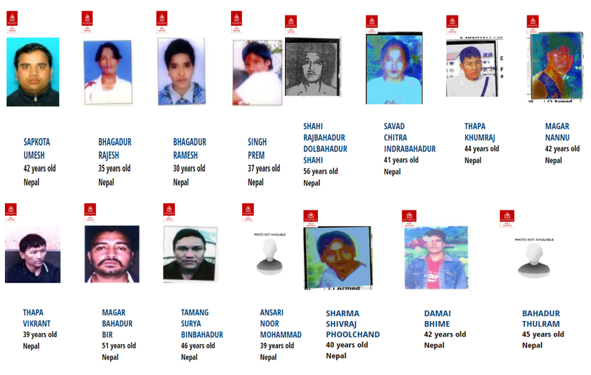 ‘रेड नोटिस’ जारी भई ‘मोस्ट वान्टेड’ सूचीमा नेपालका उमेश सापकोटा(४२), राजेश भागादुर(३५),रमेश भागादुर(३५), प्रेम सिंह(३७), डोलबहादुर राजबहादुर शाही(५६), इन्द्रबहादुर चित्र साभाद(४१), खुमराज थापा(४४), नान्नु मगर(४२) विक्रान्त थापा(३९), विरबहादुर मगर(५१), बिनबहादुर सूर्य तामाङ्ग(४६), नुर मोहम्मद अन्सारी(३९), फुलचन्द शिवराज शर्मा(४०), भिमे दमाईँ(४२) र ठुलराम बहादुर(४५) रहेको इन्टरपोलले जनाएको छ । नेपालका यी १५ नागरिकलाई अहिले इन्टरपोलको सदस्य १९६ मुलुकका प्रहरीहरुले खोजी गरिरहेका छन् । तर, यी मध्ये केही वर्षौ देखिपनि पक्राउ पर्न सकेका छैनन् ।