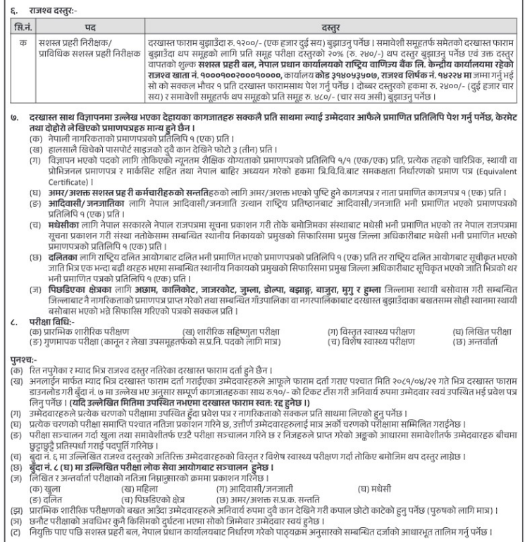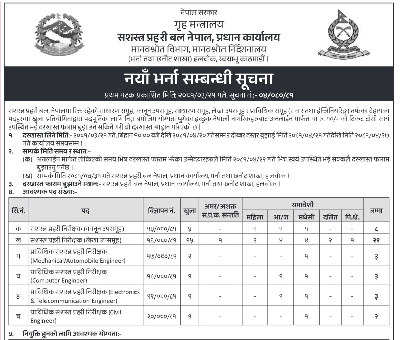 सशस्त्रले कानुन उपसमूहतर्फका लागि प्रहरी निरीक्षक (इन्सपेक्टर) ८ जना, लेखा उपसमूहतर्फ प्रहरी निरीक्षक २९ जना, विभिन्न प्राविधिकतर्फ प्रहरी निरीक्षक ११ जना माग गरेको छ । आगामी साउन २० गतेसम्म र दोब्बर दस्तुर बुझाएर साउन २१ गते देखि साउन २७ गतेसम्म दरखास्त दिन सक्ने सशस्त्र प्रहरीले जनाएको छ ।