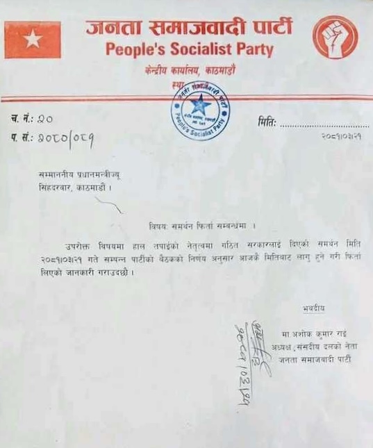 शुक्रवार बसेको अशोक राई नेतृत्वको जसपाको बैठकले सरकारलाई दिएको समर्थन फिर्ता लिने निर्णय गरेको छ । नेपाली काँग्रेस र नेकपा एमाले नयाँ सरकार बनाउने सहमती गरेसँगै जसपाले पनि सरकारलाई दिएको समर्थन फिर्ता लिने निर्णय गरेको हो । यसअघि एमालेले सरकारलाई दिएको समर्थन फिर्ता लिँदै उसका मन्त्रीहरूले राजीनामा बुझाएका थिए ।