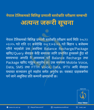 साथै, टेलिमकले सेवा प्रभावित हुन सक्ने हुदाँ उक्त समयभन्दा अघि नै ब्यालेन्स रिचार्ज तथा प्याकेज खरिद गर्न आग्रह गरेको छ । यी सेवाहरु प्रभावित हुने भएपनि उक्त समयमा मोबाइल भ्वाइस, डाटा, एसएमएस तथा एफटिटिएच भ्वाइस, आईपिटिभी लगायतका सेवाहरु संचालनमा रहने नेपाल टेलिकमले सूचना जारी गरी जनाएको छ ।