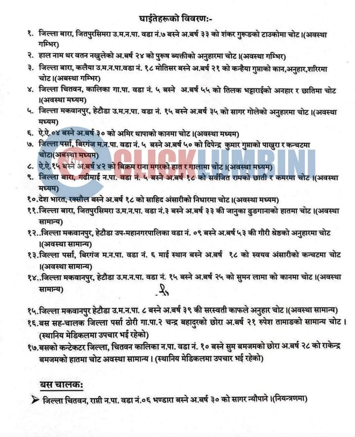 बसमा सवार २२ जना यात्रुहरु मध्ये १७ जना घाइते भएका छन् । जसमध्ये तीन जना गम्भिर, सात जना मध्यम र सात जना सामन्य घाइते भएको जिल्ला प्रहरी कार्यालय बाराका डिएसपी एवं सूचना अधिकारी दधिराम न्यौपानेले जानकारी दिए । घाइते यात्रुहरुको उपचारका लागि वीरगंजको बयोधा अस्पतालमा पठाइएको र बस चालकलाई नियन्त्रणमा लिएर घटनाको अनुसन्धान सुरु गरिएको उनले बताए ।