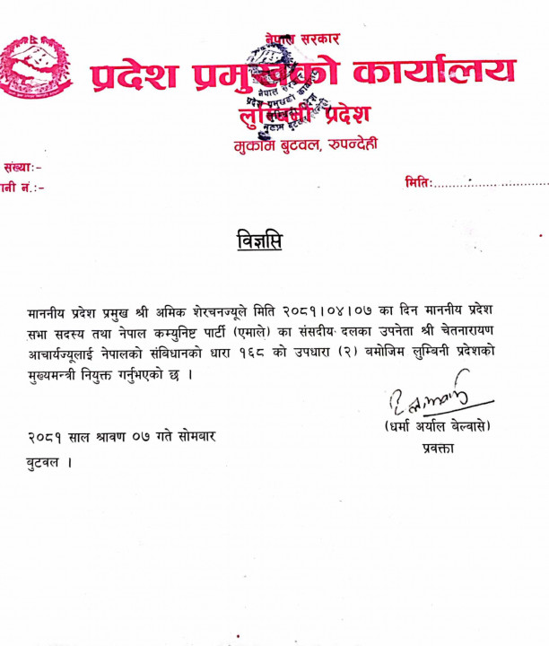 भैरहवा, ७ साउन । लुम्बिनी प्रदेश प्रमुख अमिक शेरचनले प्रदेश मुख्यमन्त्रीमा चेतनारायण आचार्यलाई नियुक्त गरेका छन् । नेपालको संविधानको धारा १६८ को उपधारा (२) बमोजिम प्रदेश प्रमुखले मुख्यमन्त्री नियुक्त गरेको प्रदेश प्रमुख कार्यालयबाट जारी विज्ञप्तीमा उल्लेख छ ।