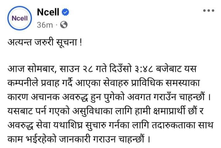 प्रवाह हुनेमा सेवा अवरुद्ध भएपछि एनसेलले फेसबुकमा एक सूचना जारी गर्दै प्राविधिक समस्याका कारण अचानक अवरुद्ध सेवा सुचारु गर्नका लागि तदारुकताका साथ काम भईरहेको जनाएको छ ।